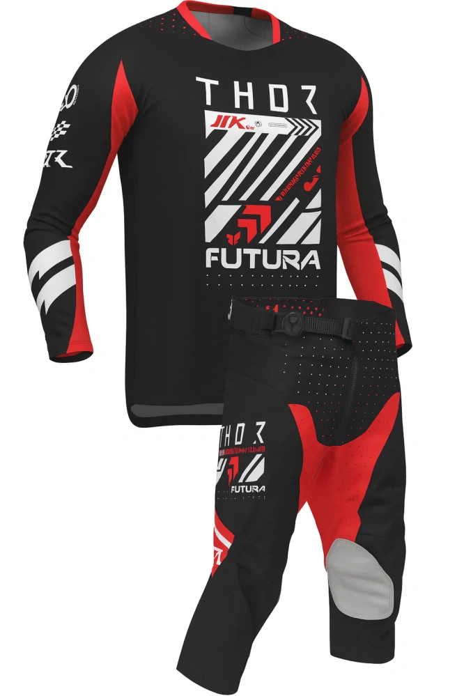 - A Dětský sportovní motokrosový komplet kalhot a dresu THOR LAUNCHMODE RACEWEAR FUTURA barva černá/červená velikost 26+L