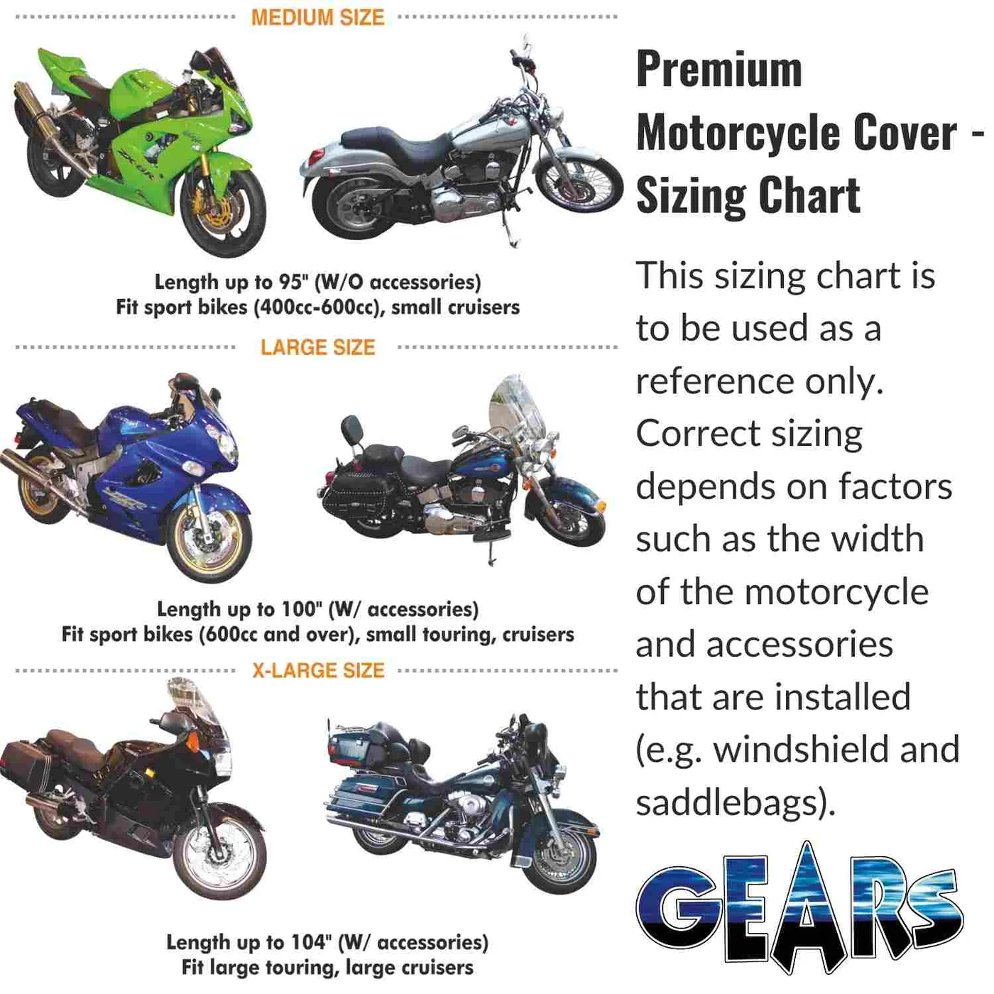 - Velikost X-Large má vzadu otvor na suchý zip, který umožňuje vysunutí duálních antén a snadný přístup k zavazadlům, (až 264 cm (104”)), pro velké cestovní motocykly