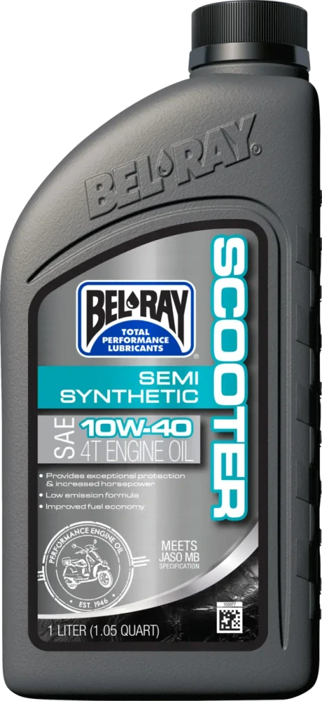 - Polosyntetický motorový olej Bel-Ray® Scooter SAE 10W-40 4T je prémiové mazivo vyvinuté speciálně pro jedinečné potřeby čtyřtaktních motorů a hnacích ústrojí skútrů s malým zdvihovým objemem.