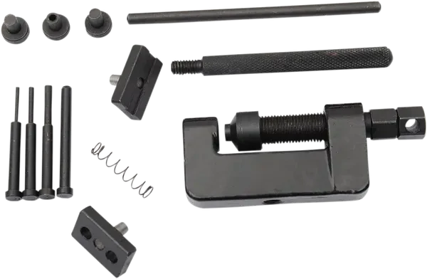 - Součástí balení jsou kolíky o průměrech 2, 3 a 4 mm, které pasují na většinu motocyklových řetězů, přítlačné desky a všechny potřebné komponenty.